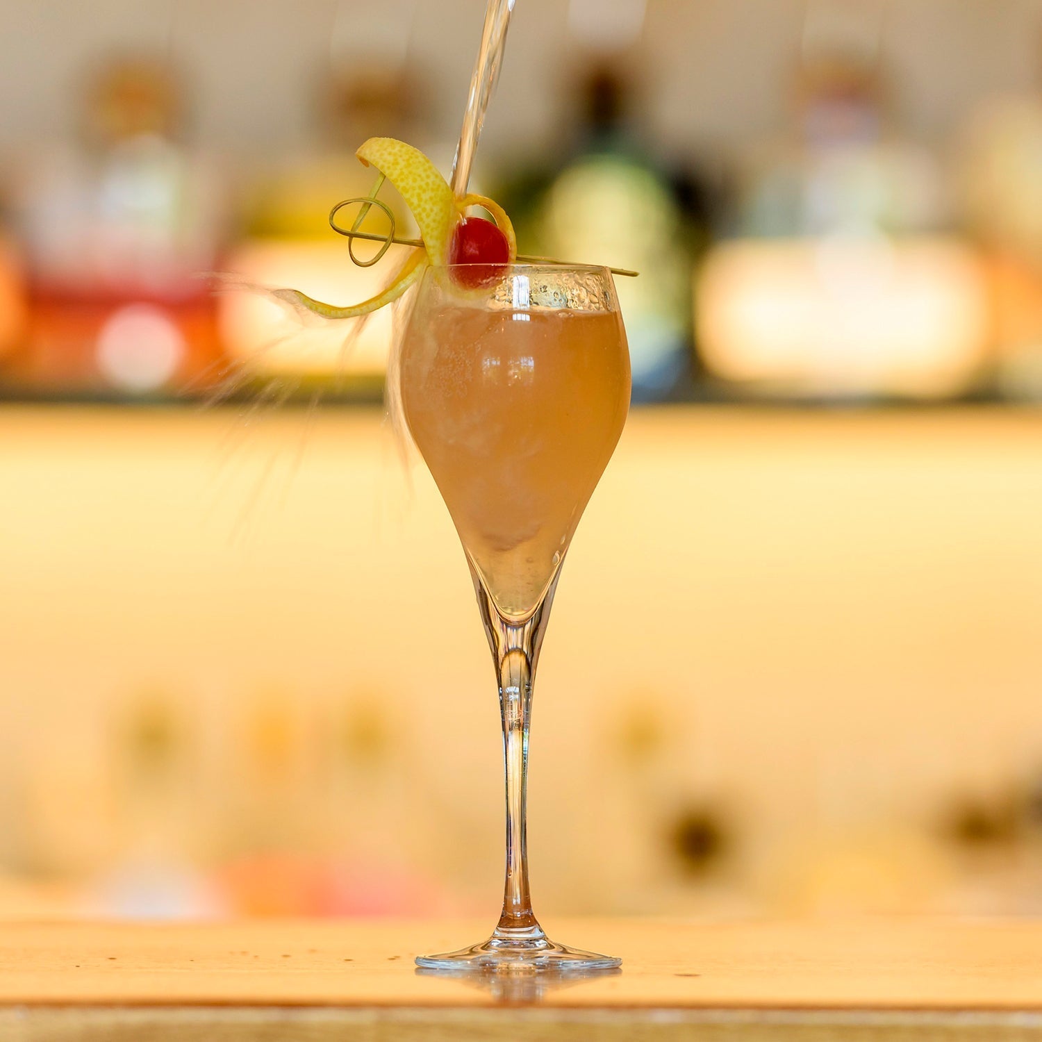 3. Garnish with glacé cherry and lemon peel